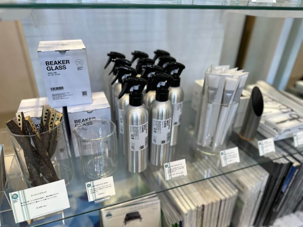 組織培養水草もあったんですが、ずっとお兄さんが店員さんと組織培養水草を選定している状態だったので見ることは叶いませんでした……。グッズもあります。ADA LAB限定商品もある。ビーカーが確かそうだったような。割りそうと思って買わなかったんですが今思えば買えばよかったかな。